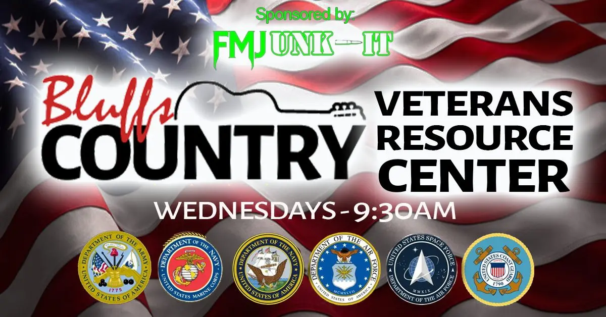 AT BLUFFS COUNTRY RADIO, WE ARE DEDICATED TO SERVING THOSE WHO HAVE SERVED OUR COUNTRY. JOIN US WEDNESDAY MORNINGS AT 9:30 FOR BLUFFS COUNTRY VETERANS RESOURCE CENTER WHERE WE WILL BE SHARING USEFUL INFORMATION ON ALL MATTERS CONCERNING THE WELL-BEING OF VETERANS. JOIN CARLENE HALL AND A VARIETY OF GUEST EXPERTS FROM VETERANS SERVICE ORGANIZATIONS AT THE FEDERAL, STATE, COUNTY AND LOCAL LEVELS. BLUFFS COUNTRY VETERANS RESOURCE CENTER EVERY WEDNESDAY MORNING AT 9:30 RIGHT HERE ON BLUFFS COUNTRY 106.5. AT BLUFFS COUNTRY, EVERY DAY IS VETERANS DAY.